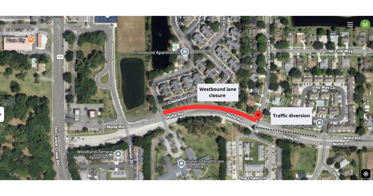 Kissimmee, Florida - Toho Water Authority (Toho) is announcing a road closure in the westbound lane of Nolte Road between the west entrance of Pine Chase Circle and Crestwood Circle (please see map). Westbound traffic is being diverted into the eastbound lane during the repair. The closure is necessary to conduct a sewer repair project in the area.